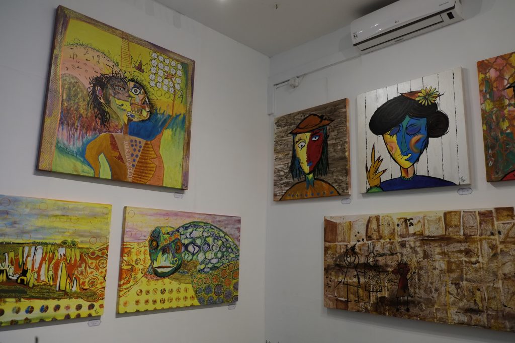 Having lived in both Colombo and Sydney, the two drastically different communities inspirited me to keep painting. I use acrylics and mixed media techniques for my paintings. My fascination with the human mind led me to explore the way a child’s mind perceives things. Their raw imagination leads to mesmerizing, mismatched yet holistic drawings that makes sense only to them and also leaves them invariably happy. The irregular shapes and funny outfits painted by the little ones created unique designs that inspired me infinitely. Thus, I sometimes imagine textures and imprint them on figures to show how vibrant things can be only if you give space to imagine things that way. I’ve also drawn inspiration from Picasso’s faces that refined some of my painting while Basquiat’s style helped me imagine crazy again. In terms of my color palette, David Hockney and Barbara Sansoni have influenced it.